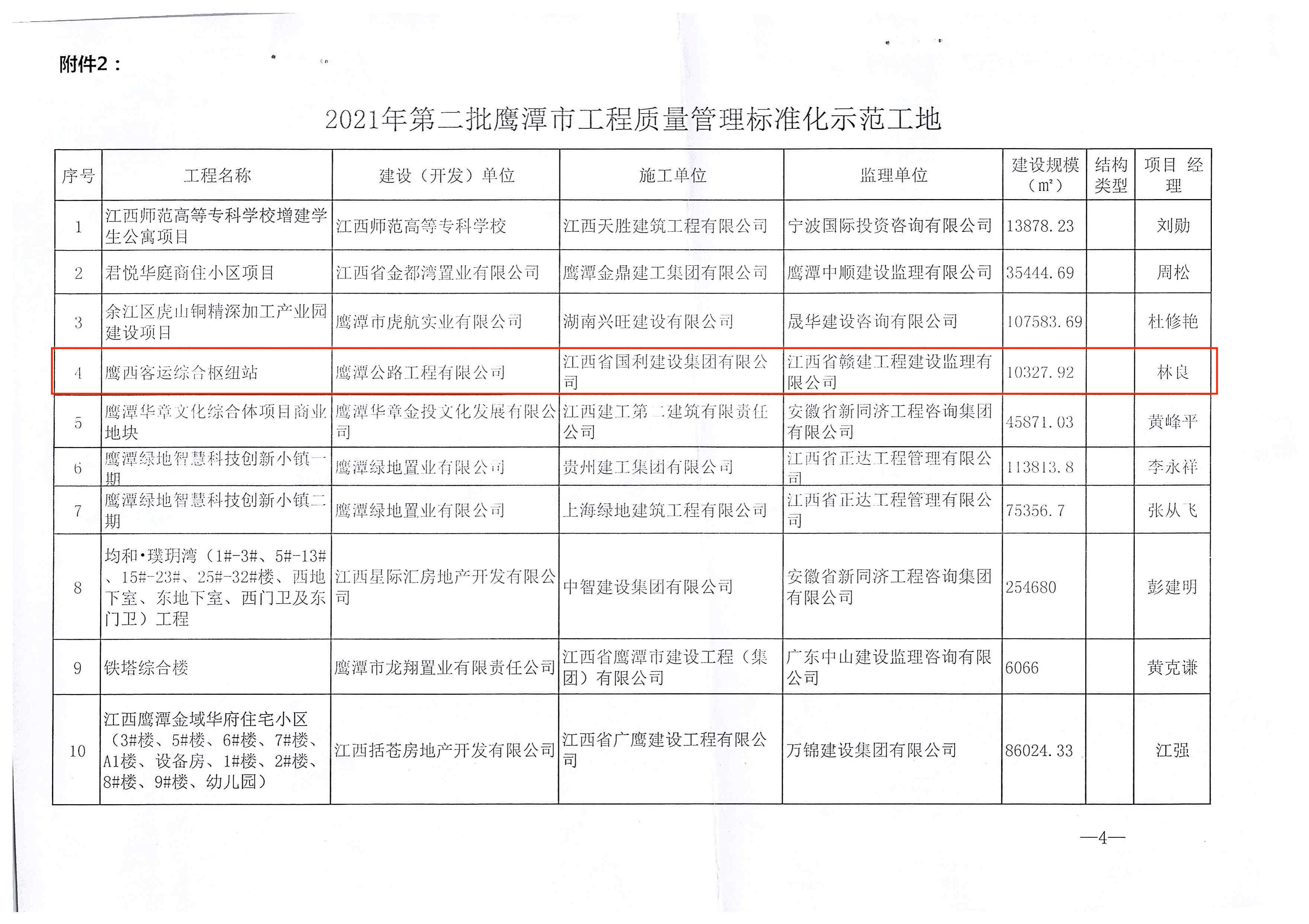 国利建设讯:由建筑施工单位申报,经鹰潭市建筑业协会组织专家进行检查、评审、推荐、公示,并经鹰潭市住房和城乡建设局局长办公会研究通过,国利建设集团承建的鹰西客运综合枢纽站工程荣获“2021年第二批鹰潭市工程质量管理标准化示范工地”。 鹰西客运综合枢纽站工程位于鹰潭市月湖区四海西路与银杏路交汇处西南面,项目主体建筑面积10327.92m²,地下建筑面积3658.89m²,合同价33622583.87元,工期为360天,该项目工程为鹰潭市形象工程。 多年来,集团公司始终坚持不断创新施工技术、加强质量管控,加大对“精品工程”的培育力度,在工程质量管理过程中,严格按照国家规范标准进行施工,层层落实工程质量目标与责任,认真做到强化事前控制,严格过程监管,创建了一个又一个优质工程、示范工程和精品工程。集团公司将以此奖励为契机,再接再厉,继续弘扬工匠精神,不断攀登质量高峰。